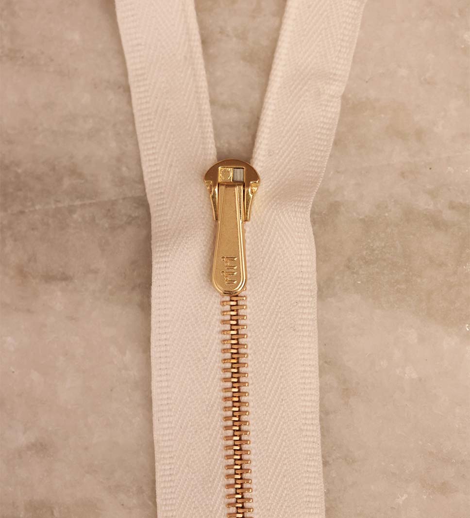 • Fermeture à glissière fabriquée en Suisse en laiton poli, fixée sur ruban de coton biologique non teint